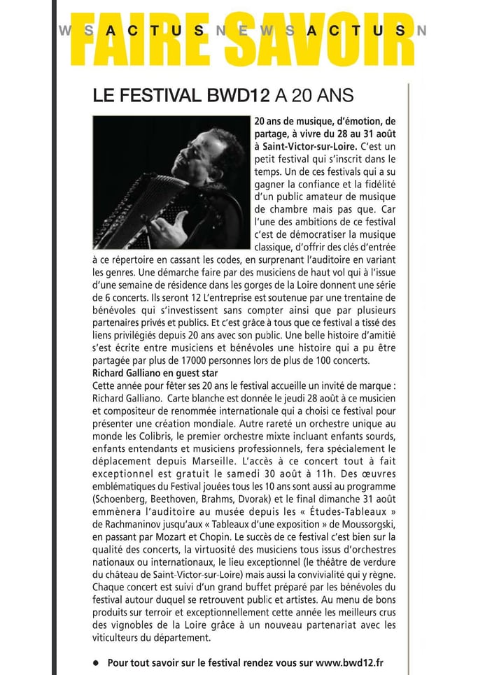 Cette année le festival de musique de chambre BWD12 fête son vingtième anniversaire. Un chemin parcouru grâce à la qualité des musiciens et d'un public assidu d'années en années. Cet été au théatre de verdure de ST-Victor sur Loire les 12 musiciens et un invité de marque en la personne de Richard Galliano célèbre accordéoniste vont ravir les mélomanes. Egalement lors d'une soirée un orchestre de jeunes enfants, atteints de surdité profonde donnera la place au monde inclusif. Rendez vous donc cet été du 28 au 31 aôut dans l'écrin du théatre de ST-Victor sur Loire pour une série de concerts.