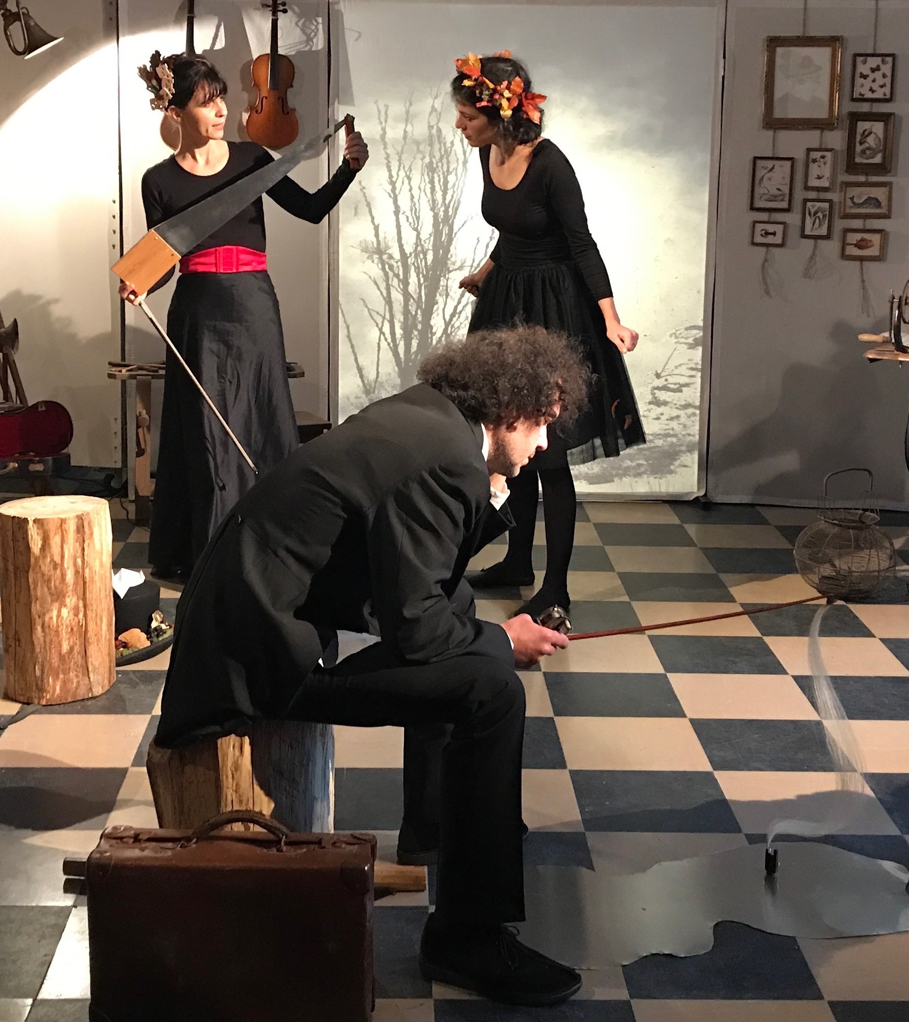 Elle y rencontre un prince de conte de fée égaré (le violoniste Fermin Ciriaco) puis un compositeur extravagant (Samuel Etienne, violoncelliste) tout occupé à pêcher des notes dans une rivière ou à construire des machines à bruits... Celui-ci lui raconte une étrange histoire qui va bouleverser sa vie... La magicienne de la forêt (Cécile Agator, violoniste), luthière, conteuse, nous dévoile alors son secret.
